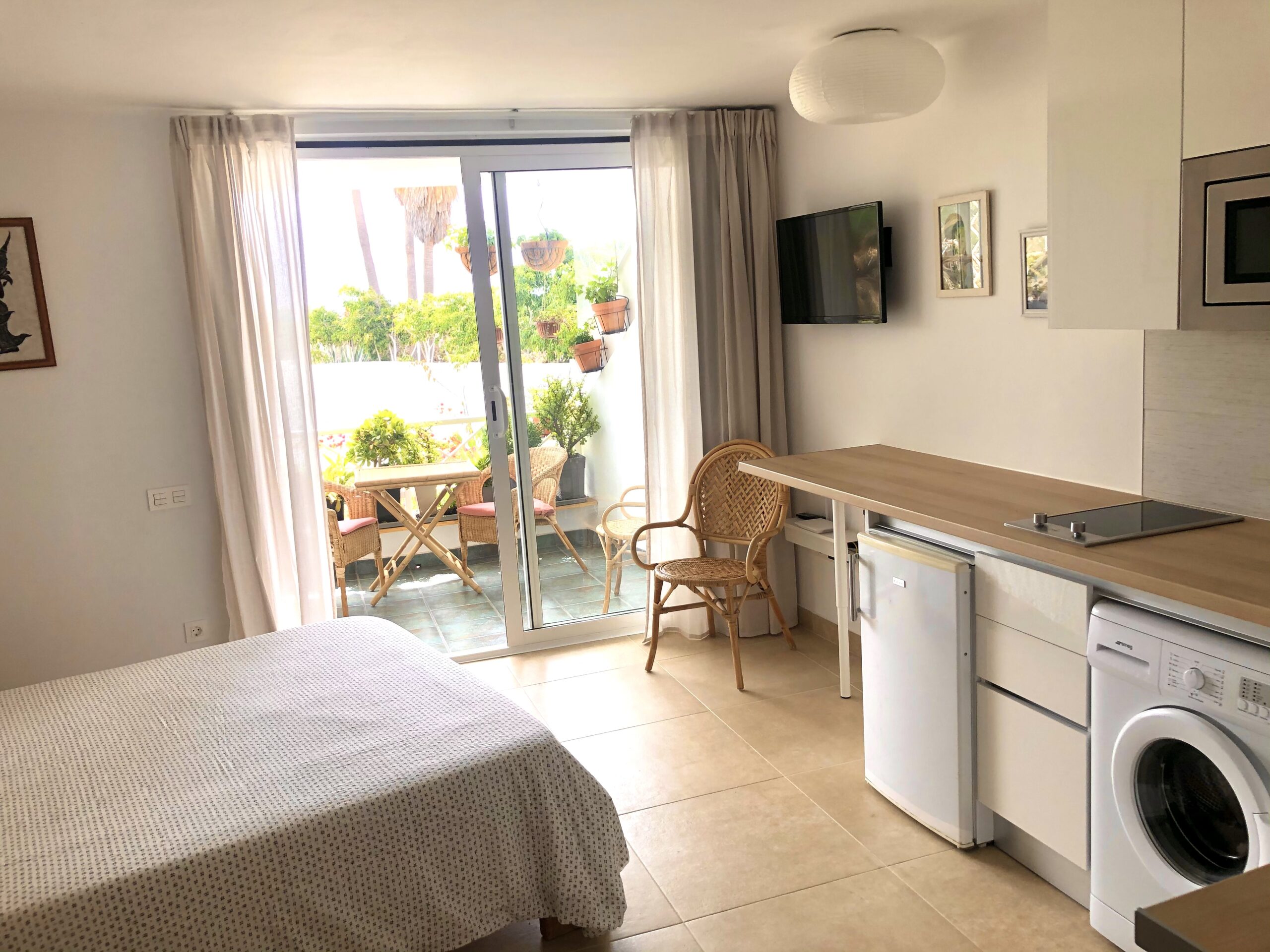 This bright and spacious, recently renovated studio apartment is set within a tranquil complex in the Old Town of Puerto del Carmen, just a short 5-minute walk from the harbour area. The securely gated complex offers two shared swimming pools and a pool bar, creating a relaxed and enjoyable atmosphere for guests. The studio is fully equipped with a kitchen including a washing machine and dishwasher, as well as a strong WiFi connection. The spacious private balcony offers beautiful views over the gardens and out towards the sea. Playa Chica beach is just 0.5 km away, making this an ideal location for both relaxation and easy access to one of the area’s most popular beaches.